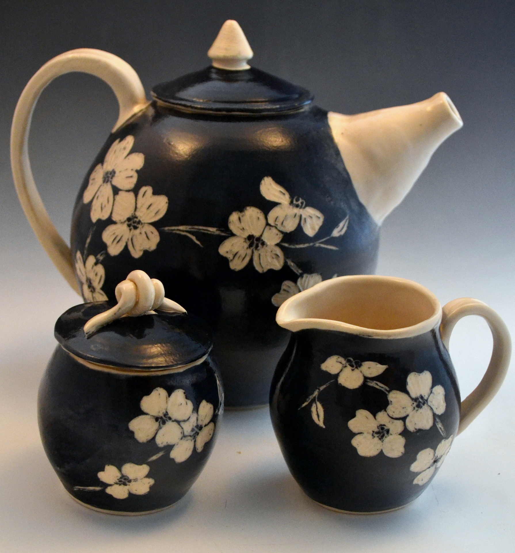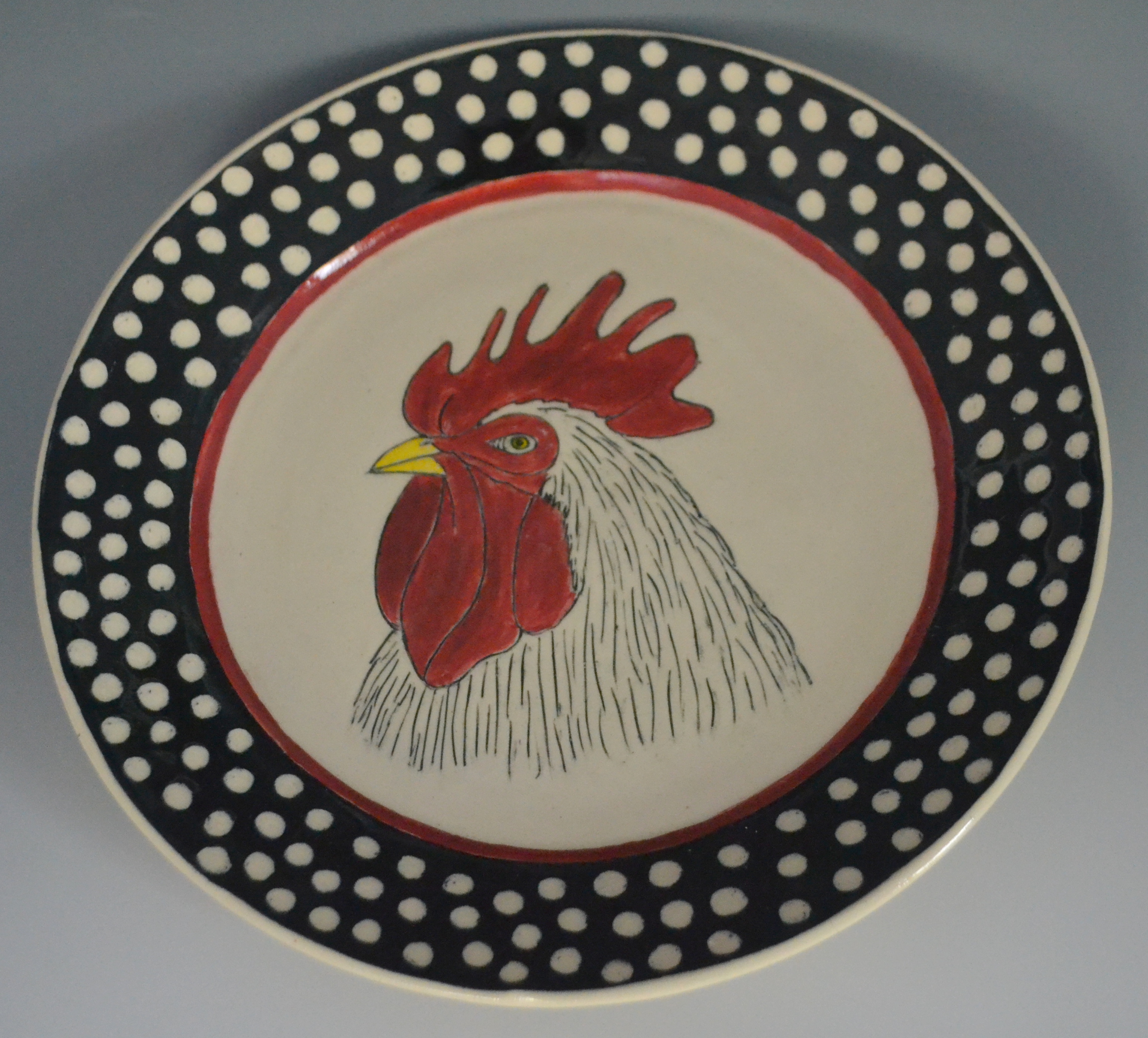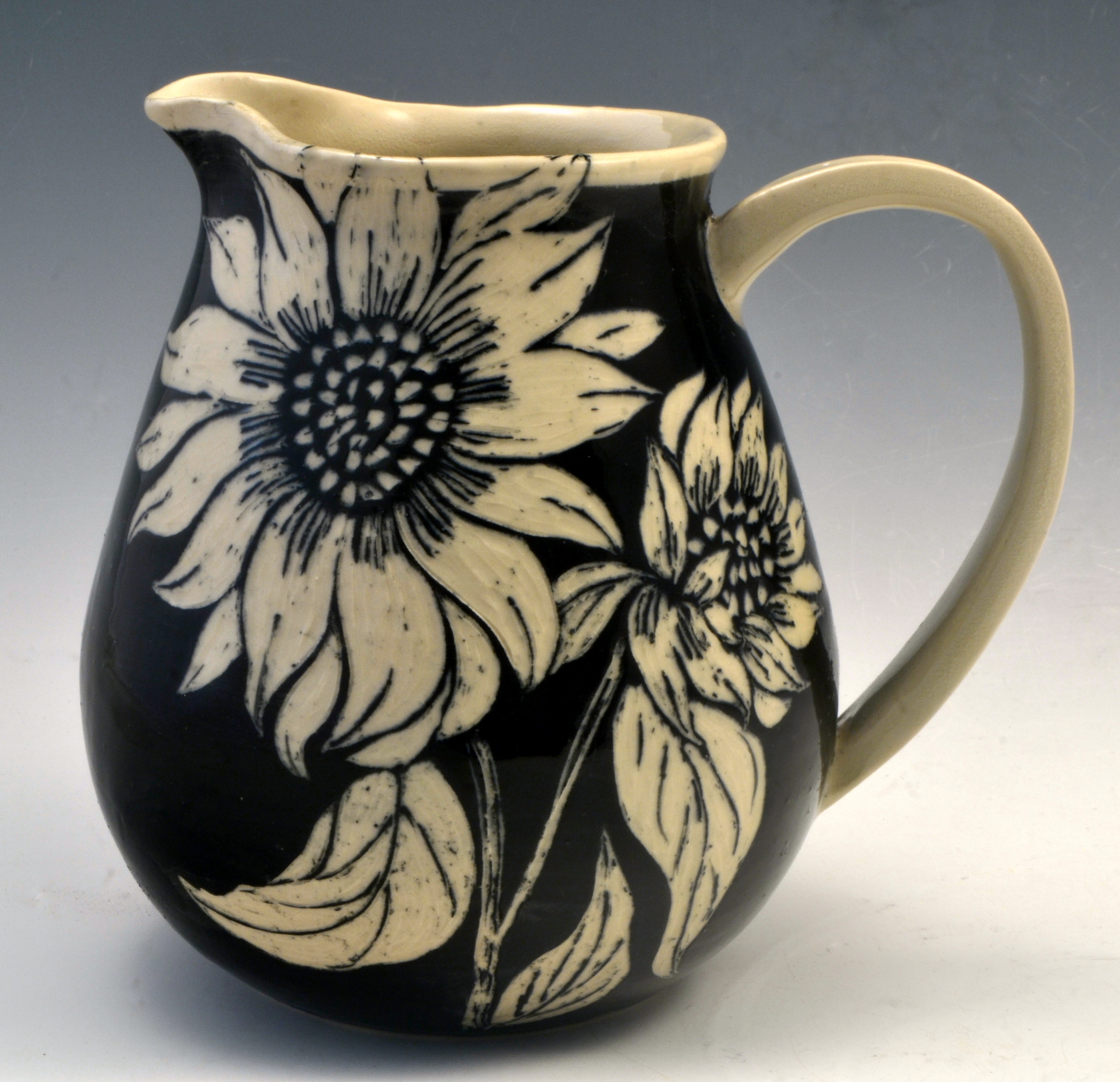 Sgraffito is a decorative technique in which a layer of color is applied to a leather-hard (unfired) piece of pottery and then the design scratched in using a small stylus and loop tool. The piece is then fired to about 1800 degrees, glazed with a clear glaze, and fired again.