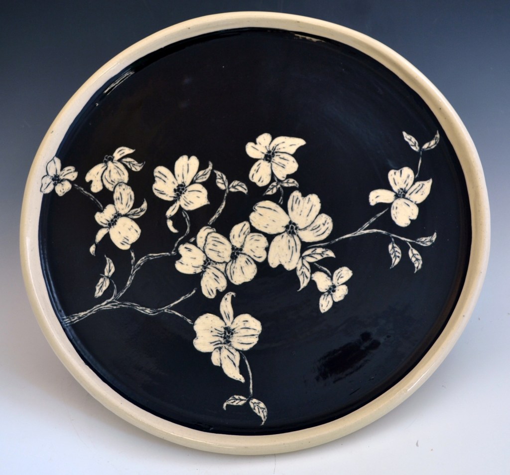 For a full plate of food for dinner or as a serving platters. Dinner plates are about 10″ across; platters vary. Dinner plates are special order only but there are usually some platters in stock. They have designs on the front and bottom. Designs will vary a little since each is hand drawn. Microwave and dishwasher safe.