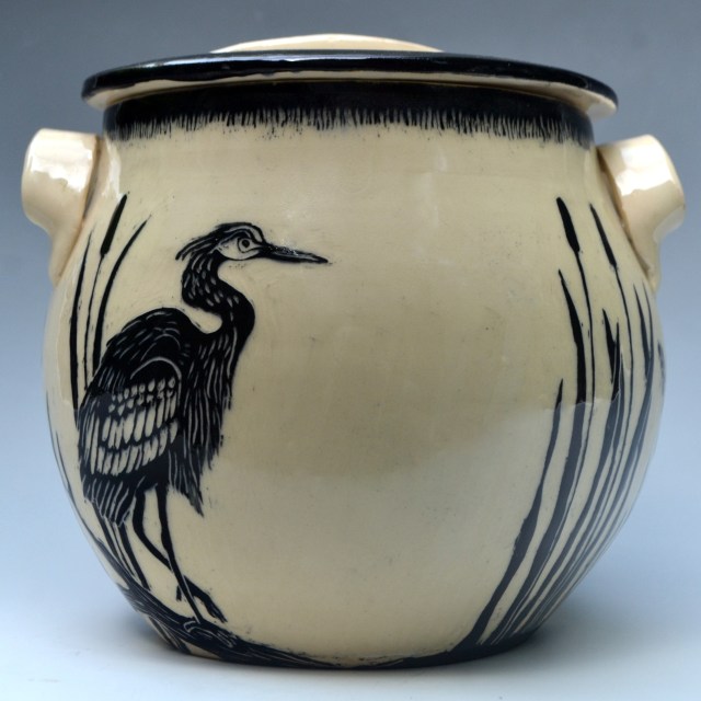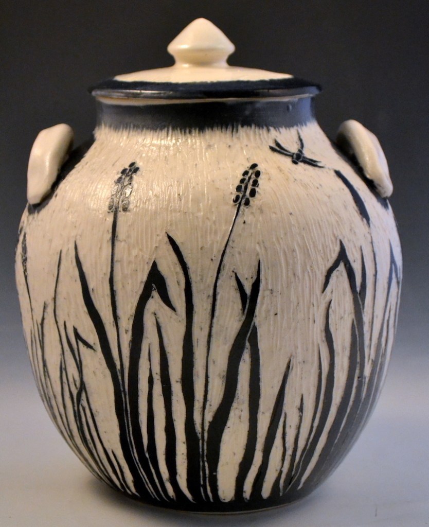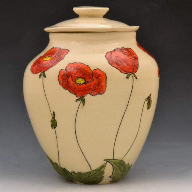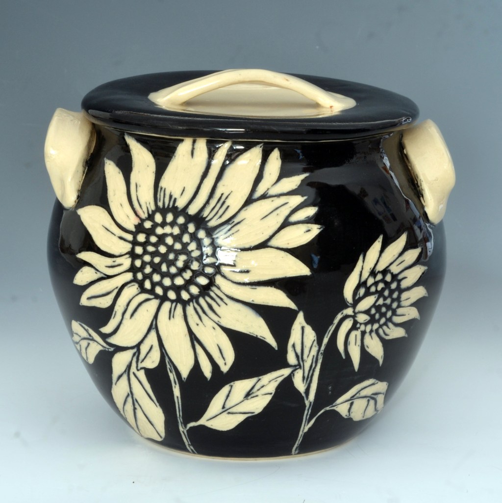 These lidded jars vary from big enough for tea bags or coffee on up to those for cookies or crackers. Designs will vary a little since each is hand drawn. Microwave and dishwasher safe.