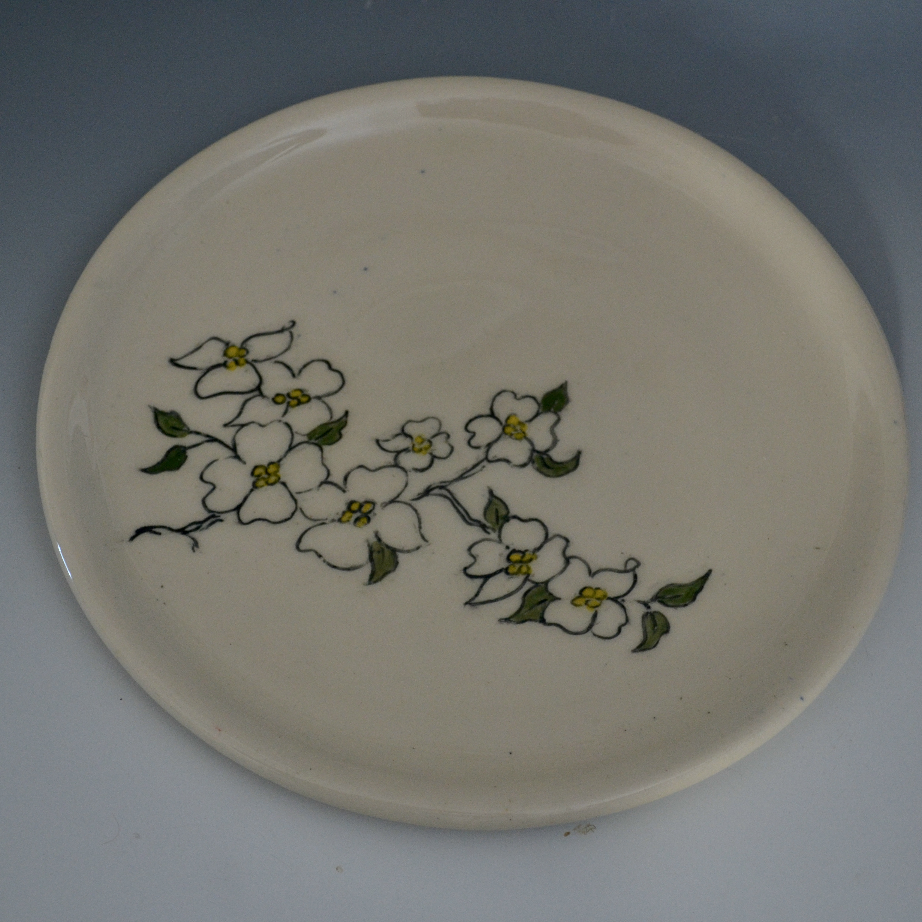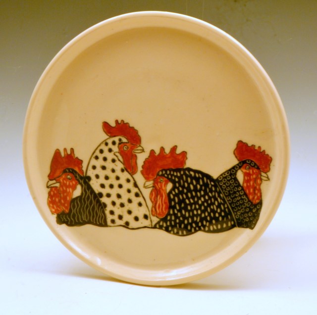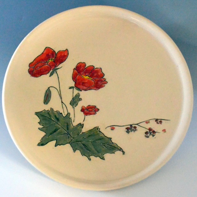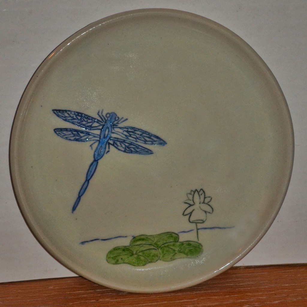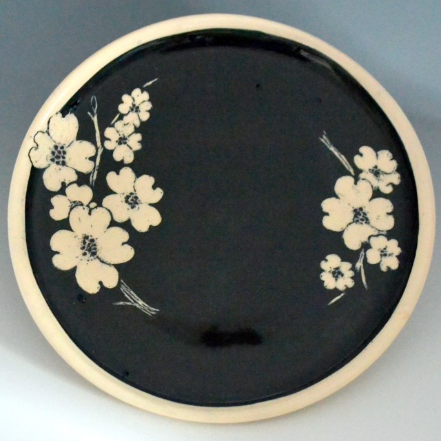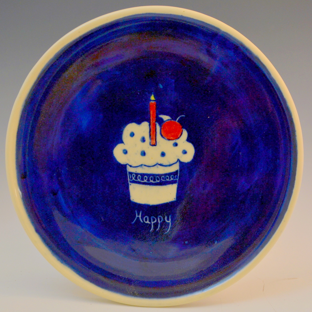 Plates are about 7 inches across, great for bread, dessert or a small salad. Salad (8.5″) and dinner (10″) sizes can be special ordered. There are designs on the top and bottom. Designs will vary a little since each is hand drawn. Microwave and dishwasher safe.