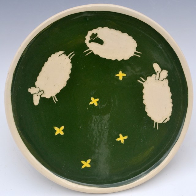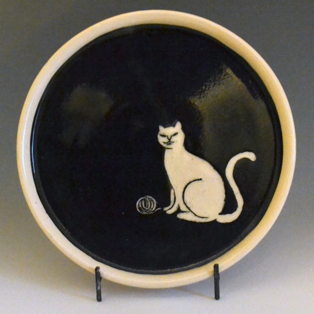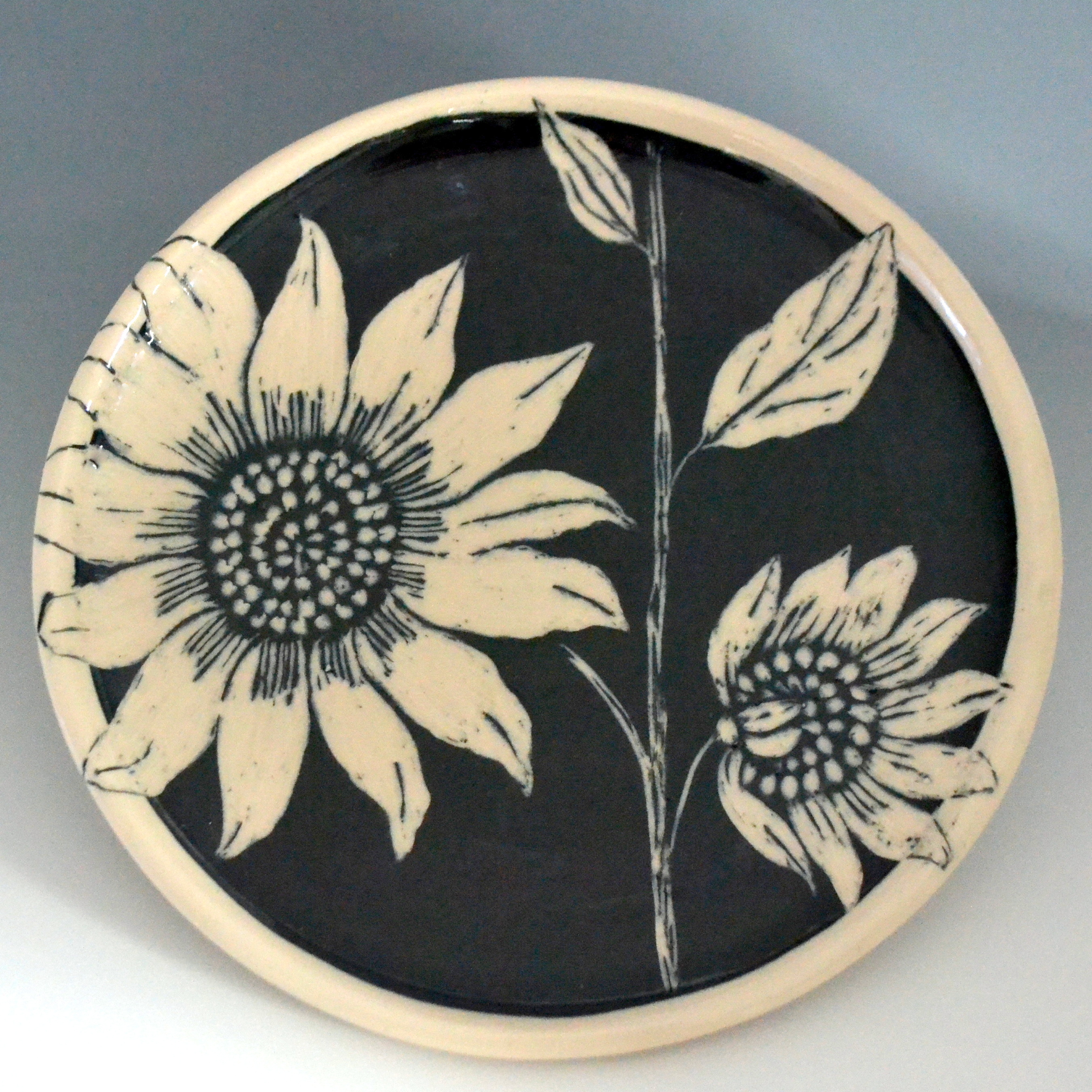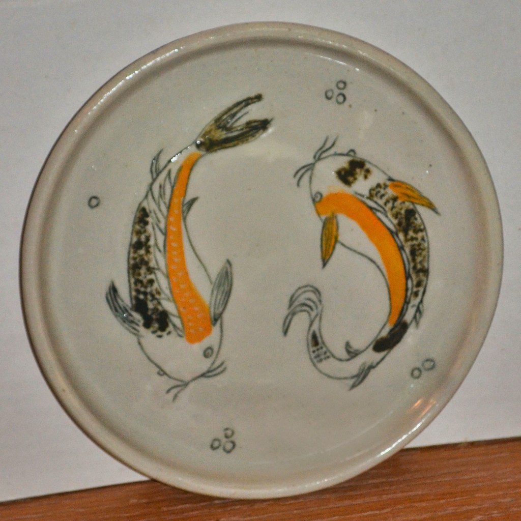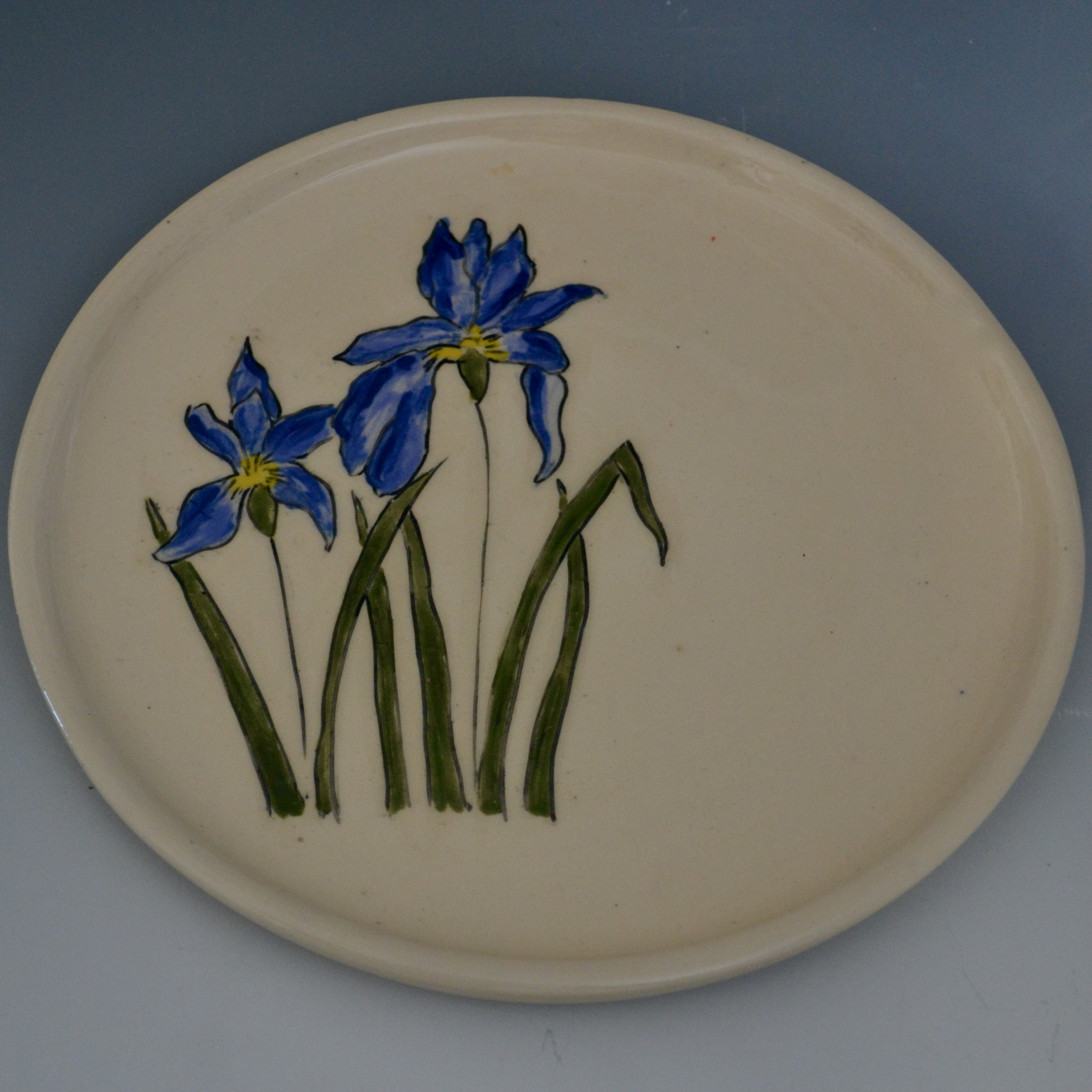 Plates are about 7 inches across, great for bread, dessert or a small salad. Salad (8.5″) and dinner (10″) sizes can be special ordered. There are designs on the top and bottom. Designs will vary a little since each is hand drawn. Microwave and dishwasher safe.